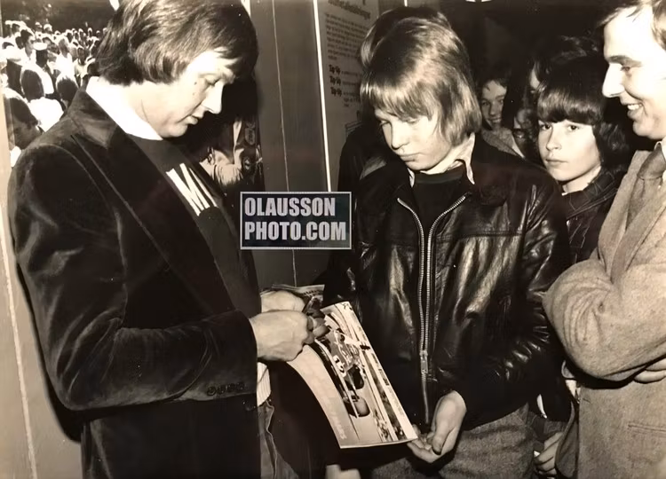 Iförd BMW-tröja - frän sponsorn i München, där han även rattade standardvagnar - skrev Ronnie autografer inför March-säsongen 1976. En stor triumf kom på Monza med den största segern med Ronnies ögon. Format 18 x 24 cm.