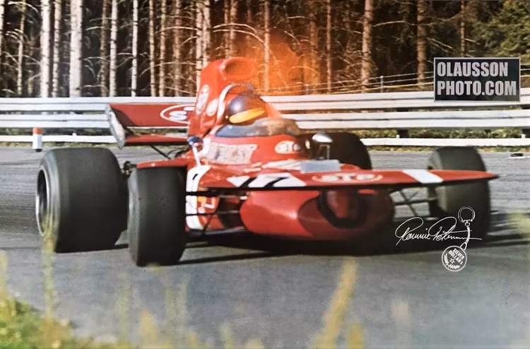 En ovanlig affisch som är svår att få tag i numera. Ronnie gjorde reklam för Silver Dollar jeans och Kenneth Olaussons foto från Österrikes Grand Prix på Zeltweg användes. Bilden är från den sista, långa högersvängen. 60 x 90 cm. Hyfsat skick. Sänds i stabil rulle.