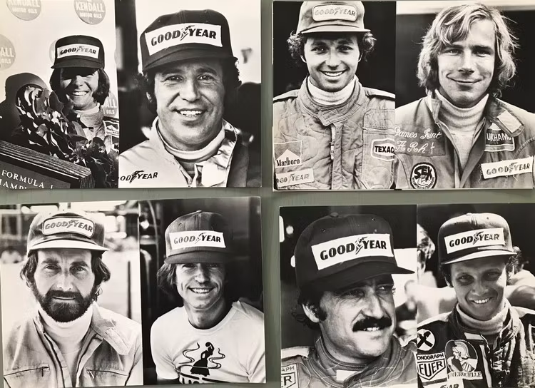 Nio fotografier på 18 F1-förare, alla iklädd GY-mössa utom James Hunt, förstås...