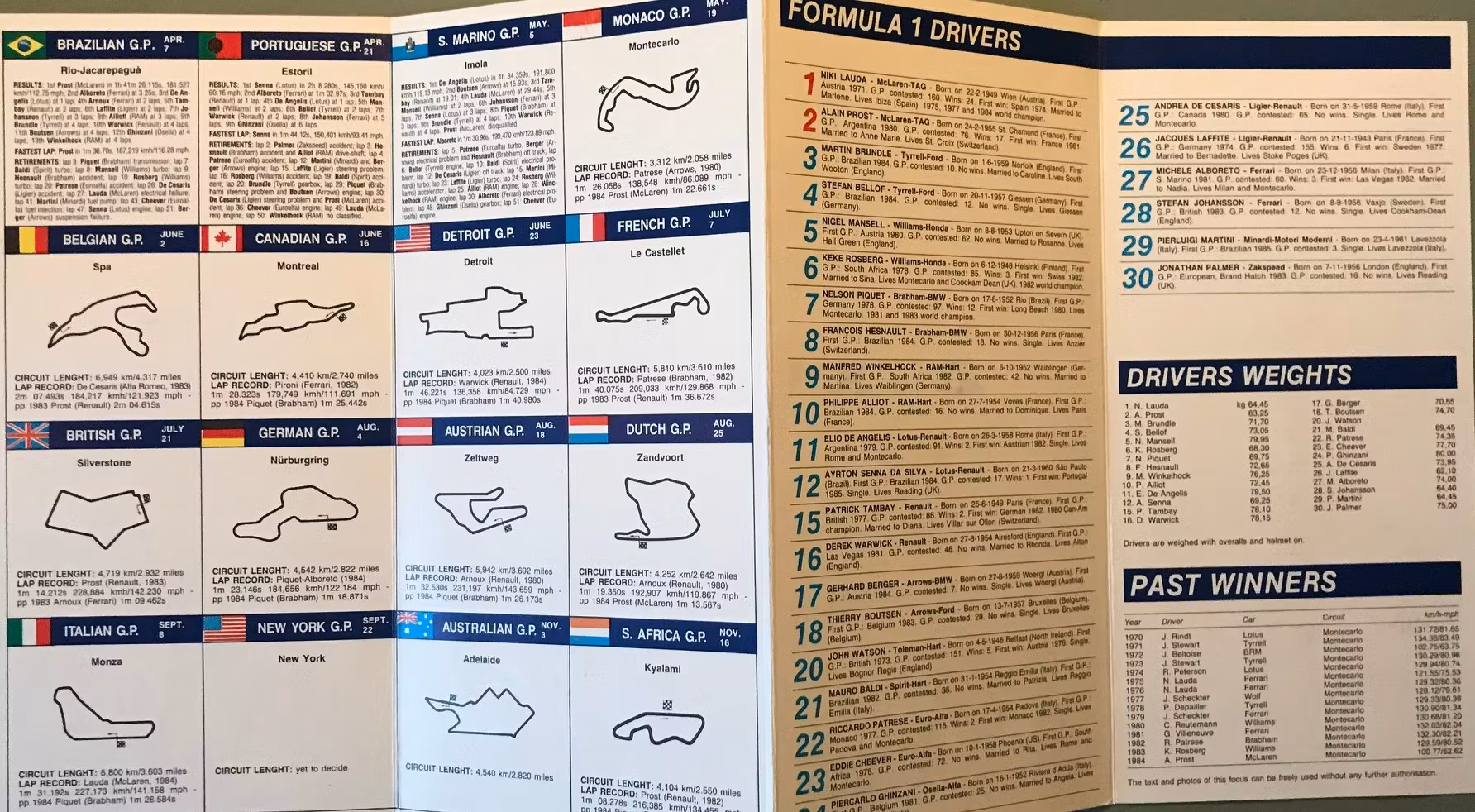 En tjusig folder med 12 sidor som utvik. Alla data med betoning på McLaren-stallet med Prost och Senna. Från 1985 då man tävlade på Monte Carlos gator helgen den 19 maj.
