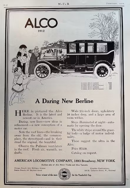 ALCO originalannons från tidningen "Motor" 1912. Dubbel segrare i Vanderbilt Cup. Broadway, New York company. 25 x 35 cm. Utmärkt skick.