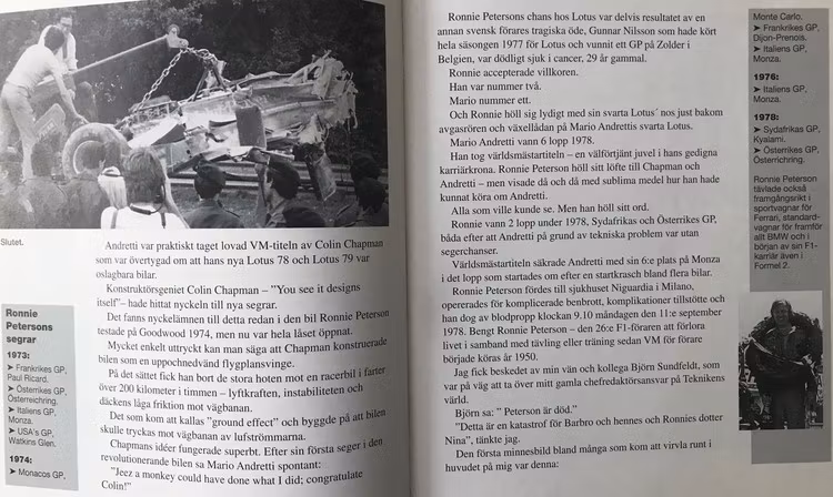 George Johansson kände Ronnie väl och har gjort ett strålande jobb om vår svenske F1-stjärna här. Format 18 x 21 cm. Hyfsat skick.