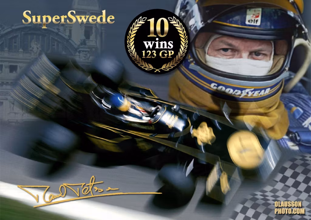 Denna nyframtagna dekal visar Ronnie i sin Lotus 72 på Monza och ett porträtt taget 1977 - båda fotografierna tagna av Kenneth Olausson.