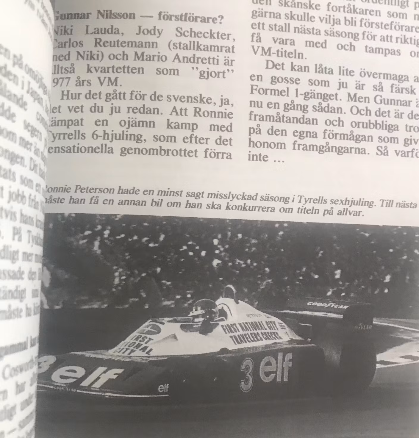 TV-profilen Sigward Andersson gjorde en årlig bok om motorsport. 1977/78 års upplaga av Motorns Mästare handlar mycket om Ronnie Peterson och hans öde under sitt näst sista år i F1 hos Tyrrell-stallet. En vederhäftig bok i häftat format 14 x 19 cm. Bra skick. 130 fullmatade sidor om motoråret 1977.