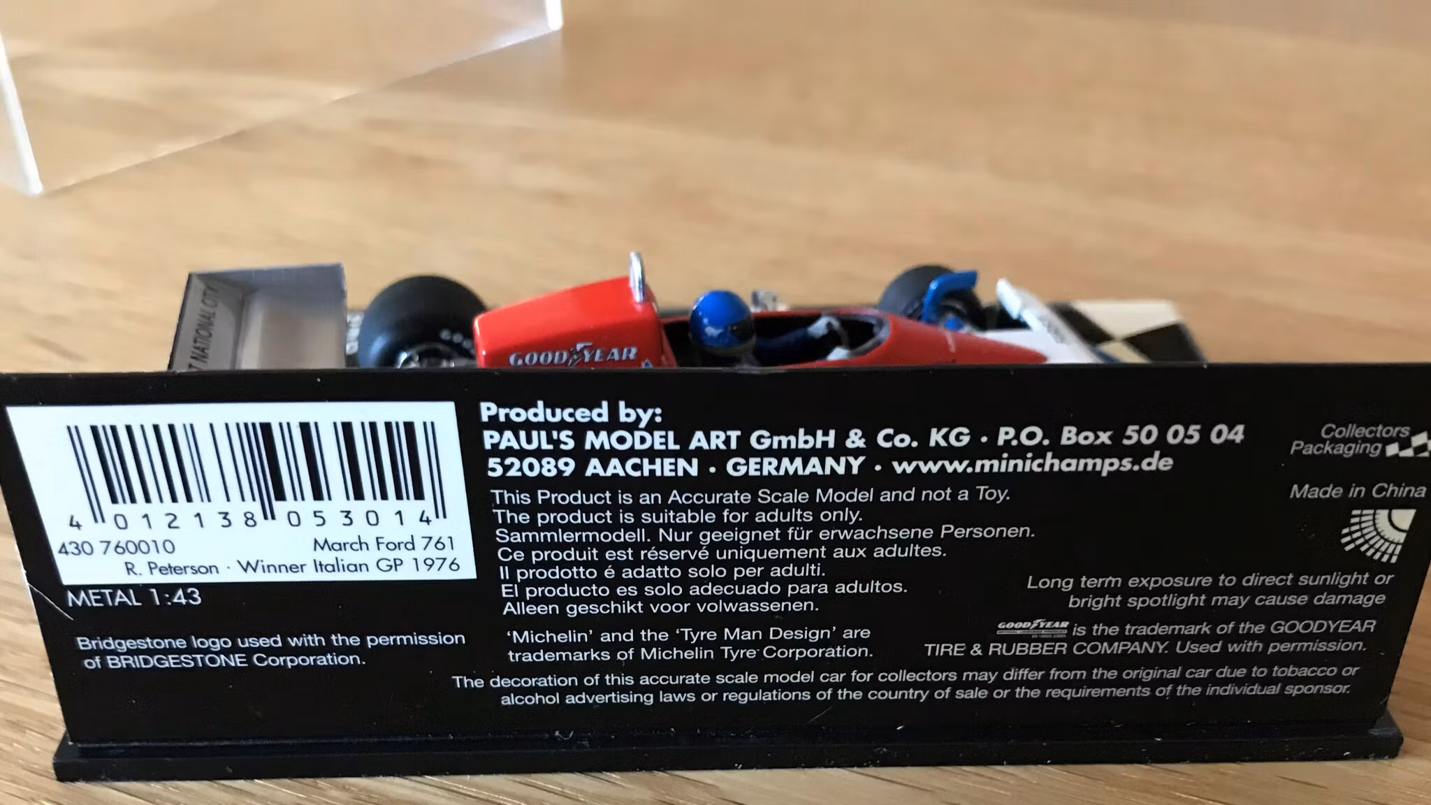 Denna fina lilla, detaljerade F1-modell kommer från Minichamps i skala 1:43. Ronnies March 761 kördes mot vinst i Italiens Gran Premio på Monza 1976.